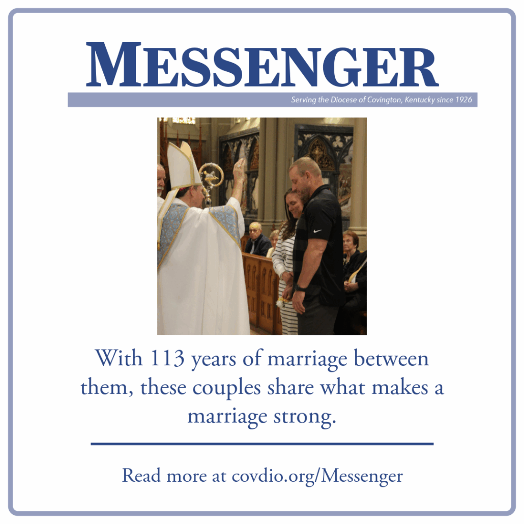 This year, the Messenger spoke with three couples who were in attendance. Linus and Ruth Ann Enzweiler, parishioners at St. Joseph Parish, Camp Spring, were celebrating their 62-year wedding anniversary. Eloy and Yazmin Fuentes, parishioners at St. John the Evangelist Parish, Carrollton, were celebrating 25 years of marriage. Josh and Stephanie Bornhorn, parishioners at Holy Cross Parish, Latonia, were also celebrating 25 years of marriage.