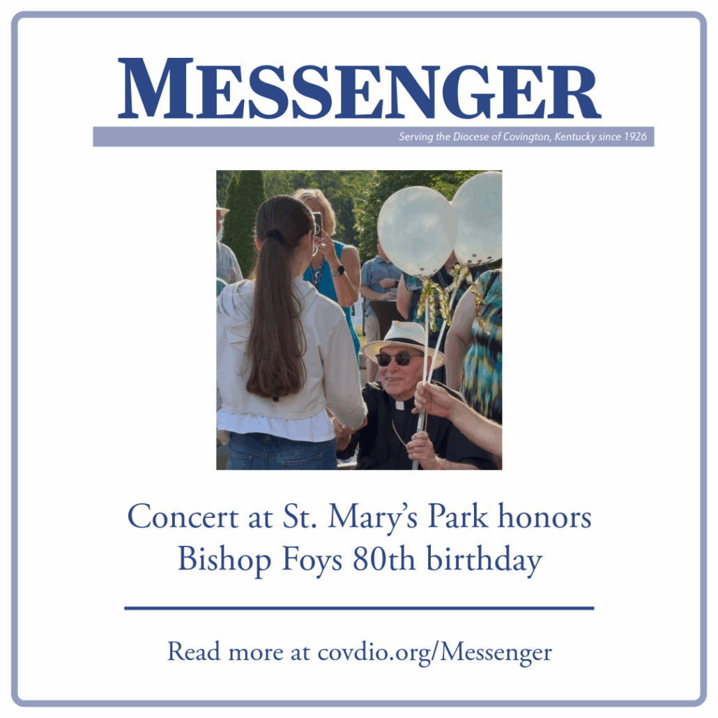 On a hot and humid evening, over 200 people gathered, July 25, at St. Mary’s Park, Covington, to celebrate the 80th birthday of Bishop Emeritus Roger Foys. The concert celebration was hosted by Bishop John Iffert and included live music by the Pete Wagner Band with Nancy James.
