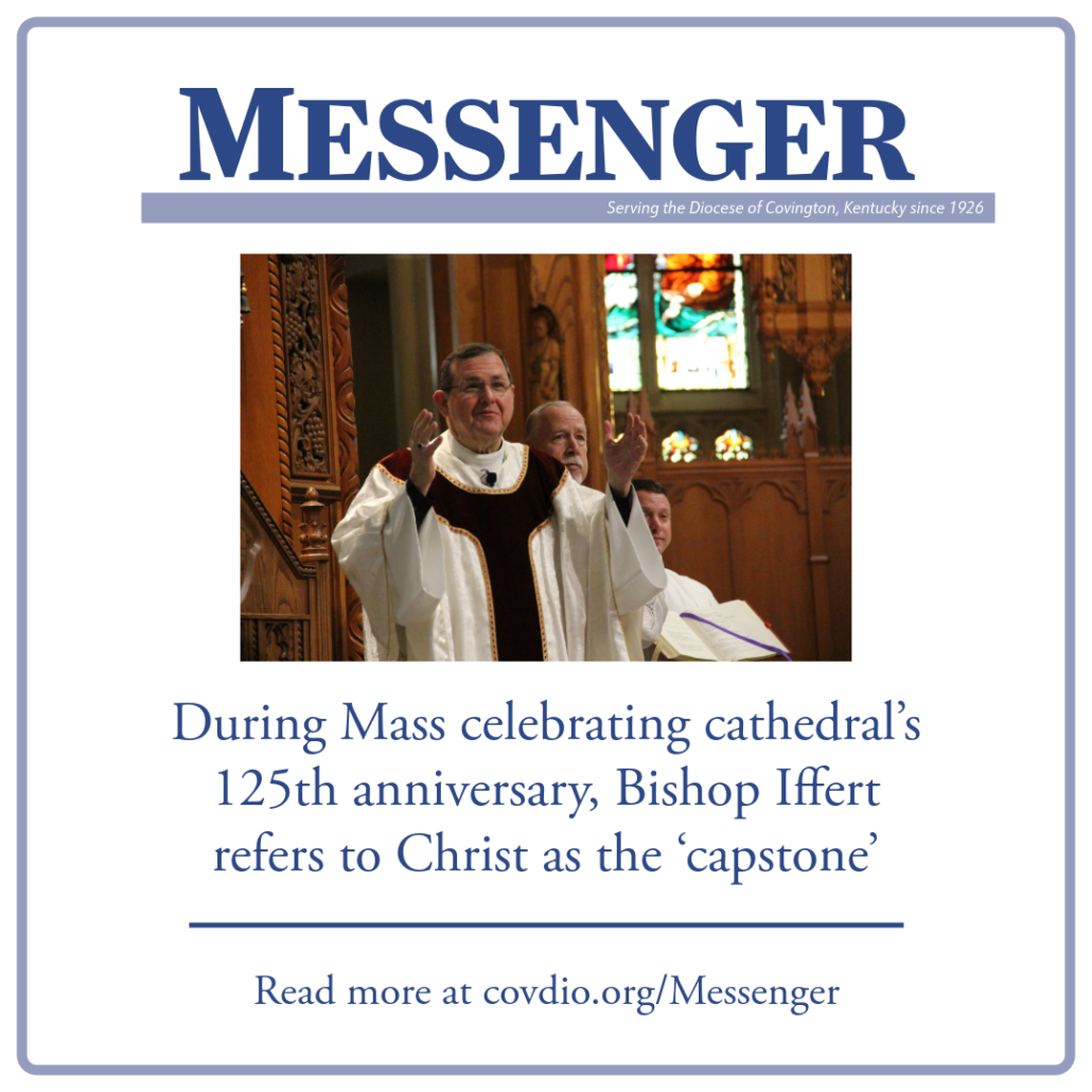 “Here in the Diocese of Covington,” he said, “this particular cathedral facility; It stands like a tabernacle lamp for all the world to see — that the love of Jesus Christ is here in Northern Kentucky. We pray that our lives might be like this cathedral — that our lives might witness to the grandeur of Christ and that the community we share might help us to draw attention to the capstone as it slides into place in our lives and takes all the force, vectors, pressures and tensions and holds us together.”