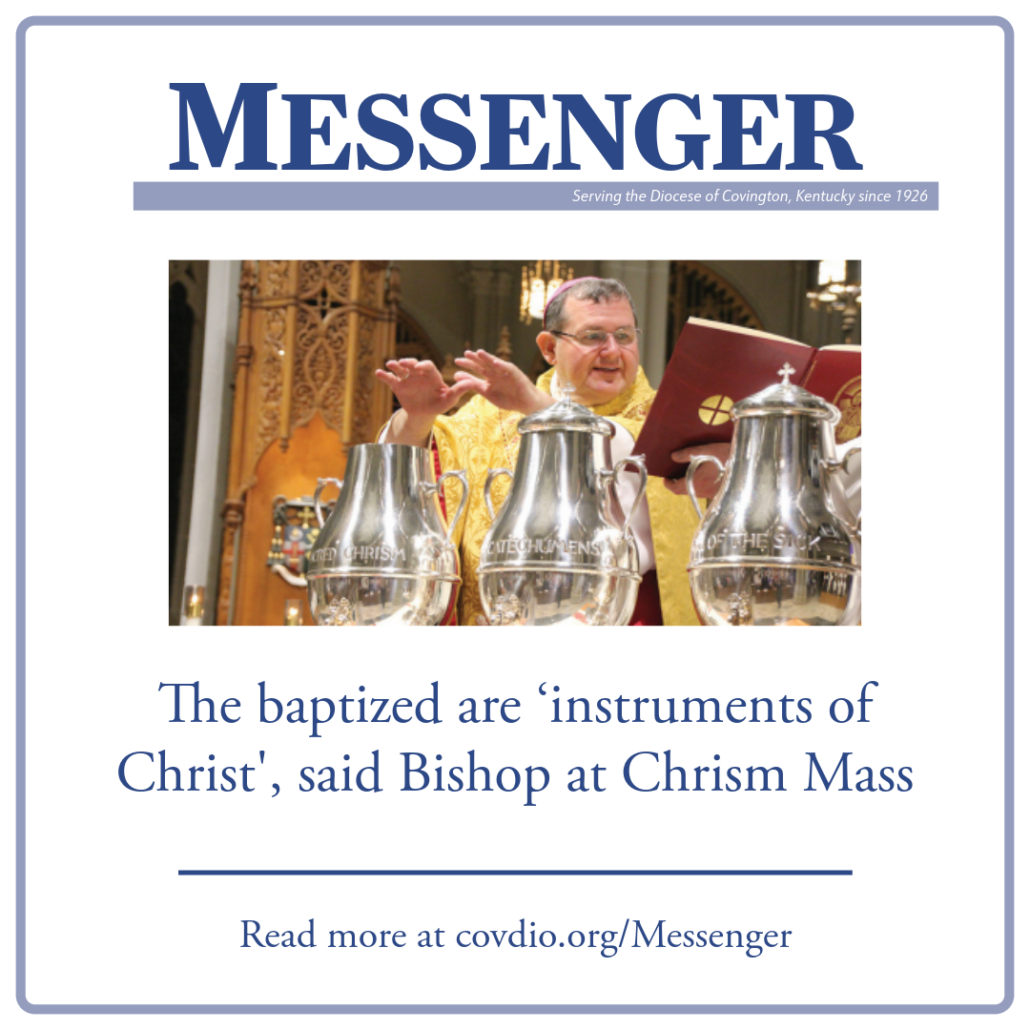 Faithful from across the Diocese of Covington came to fill the pews of the Cathedral Basilica of the Assumption, Covington, on March 31 in celebration of the annual Chrism Mass. The great diocesan assembly par excellence, priests and deacons joined Bishop John Iffert, celebrant and homilist, as he blessed the holy oils and consecrated sacred Chrism for use diocesan wide. Representatives from every parish and ministering Catholic organization attend the Chrism Mass to receive the three blessed oils for their institutions. These oils include the Oil of the Sick, Oil of the Catechumens, and the sacred Chrism. Each of these oils, blessed by the bishop, will be used in administering the sacraments in the coming year.
