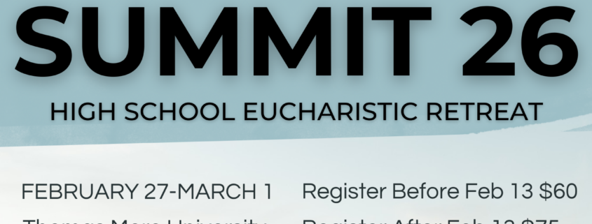 For students in 9th-12th grade. February 27 – March1 at Thomas More University. Providing joyful encounters with the Lord in music, prayer, Adoration, and reflection. Not an overnight retreat. Friday evening, all day Saturday, and Sunday morning. Cost is $60 before February 14th – $75 after. Summit Registration Form