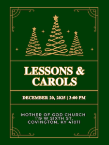 ![]() Please join the Mother of God music ministry for a Lessons and Carols concert Dec. 20, 3 p.m., Mother of God Church, Covington. Experience the joy of the season through Scripture and […] |
