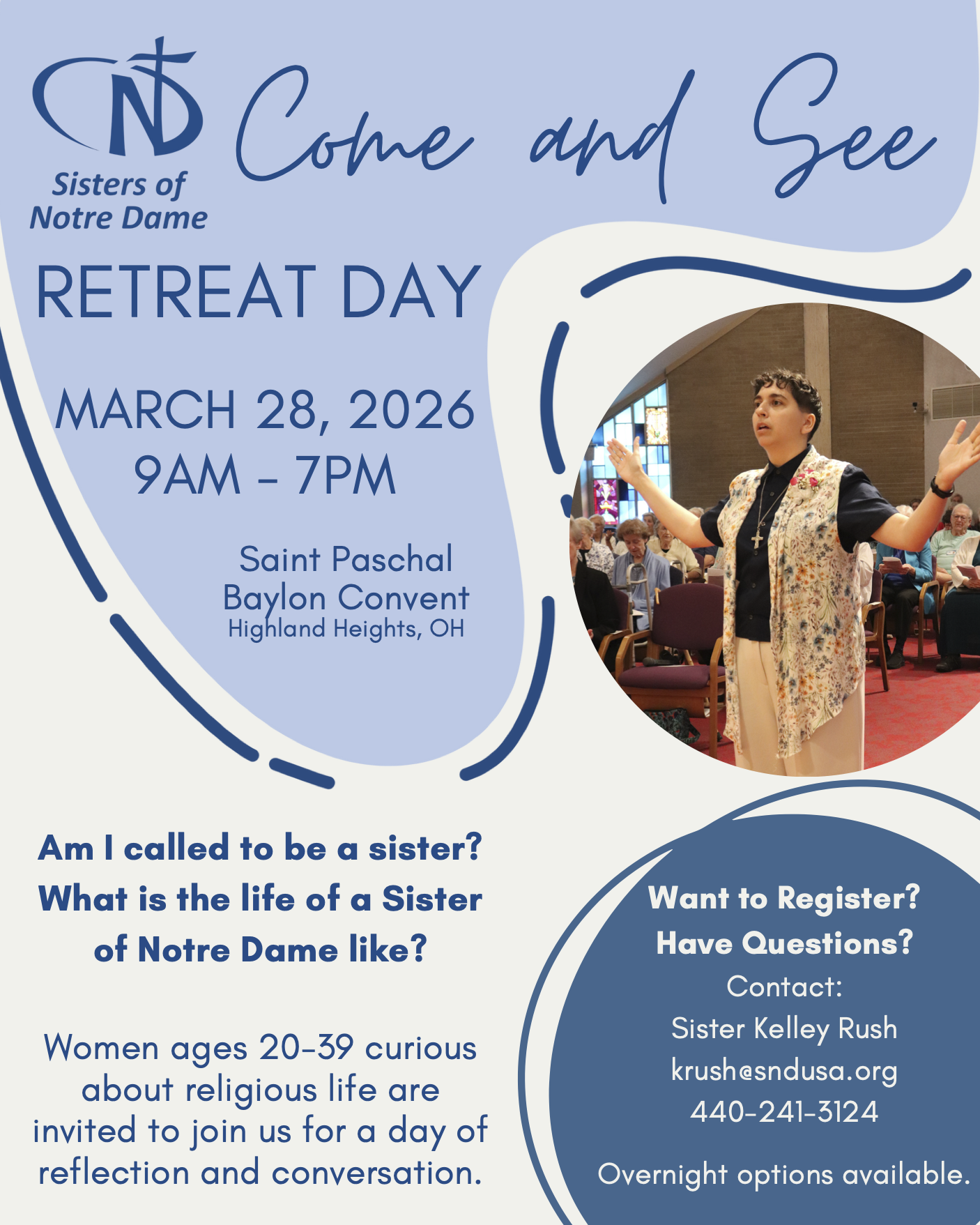 Come and See Retreat, March 28, 9 a.m.–7 p.m., St. Paschal Baylon Convent, Highland Heights, Ohio. Am I called to be a sister? What is the life of a Sister of Notre Dame like? Women ages 20-39 curious about religious life are invited to join us for a day of reflection and conversation. Contact Sister […]