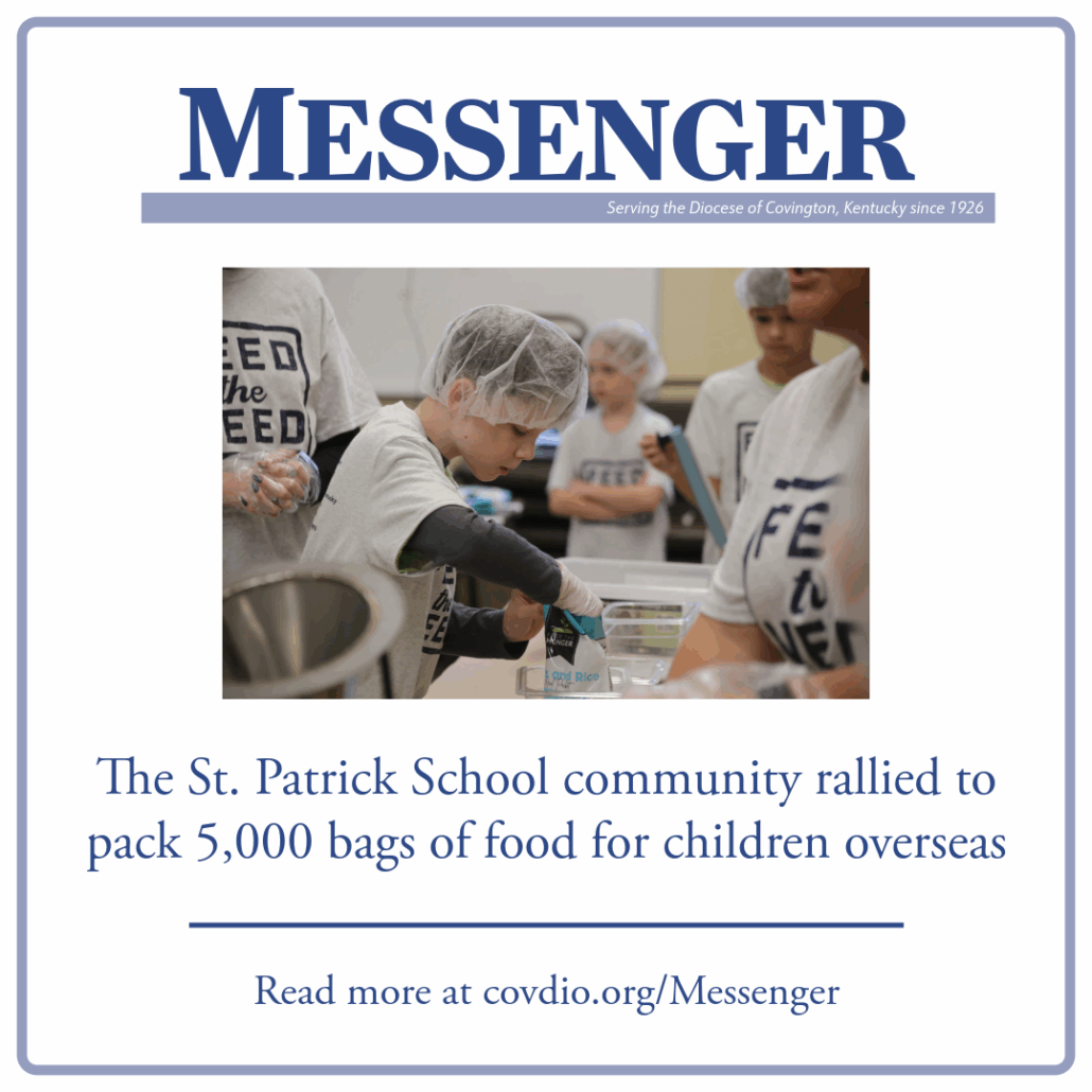 Students, families, faculty and staff at St. Patrick School, Taylor Mill, were abuzz with feelings of gratitude and giving, Nov. 21, as they participated in an on-campus service project, Feed the Need. As students packed meals to send overseas, smiles filled the room while they scooped, poured and sealed 5,000 bags of food.