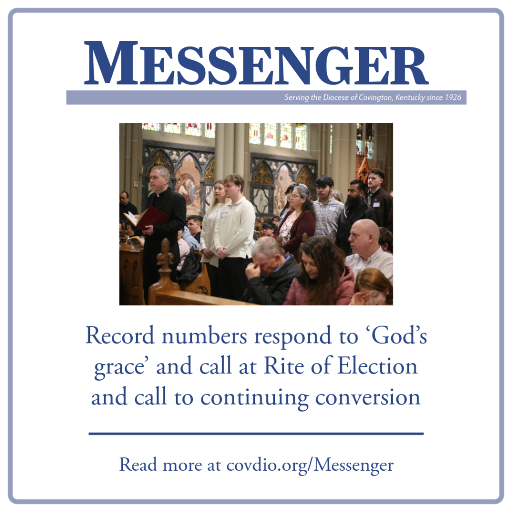 In two ceremonies, Feb. 22, pastors from 36 parishes in the Diocese of Covington and Thomas More University presented 171 catechumens and 249 candidates to Bishop John Iffert. Catechumens are unbaptized individuals seeking to enter the Catholic Church. During the Rite of Election each is called forward by name, receive a blessing from Bishop Iffert and had their name inscribed in the Book of the Elect, which Bishop Iffert signed, declaring them the Elect — God’s chosen people.