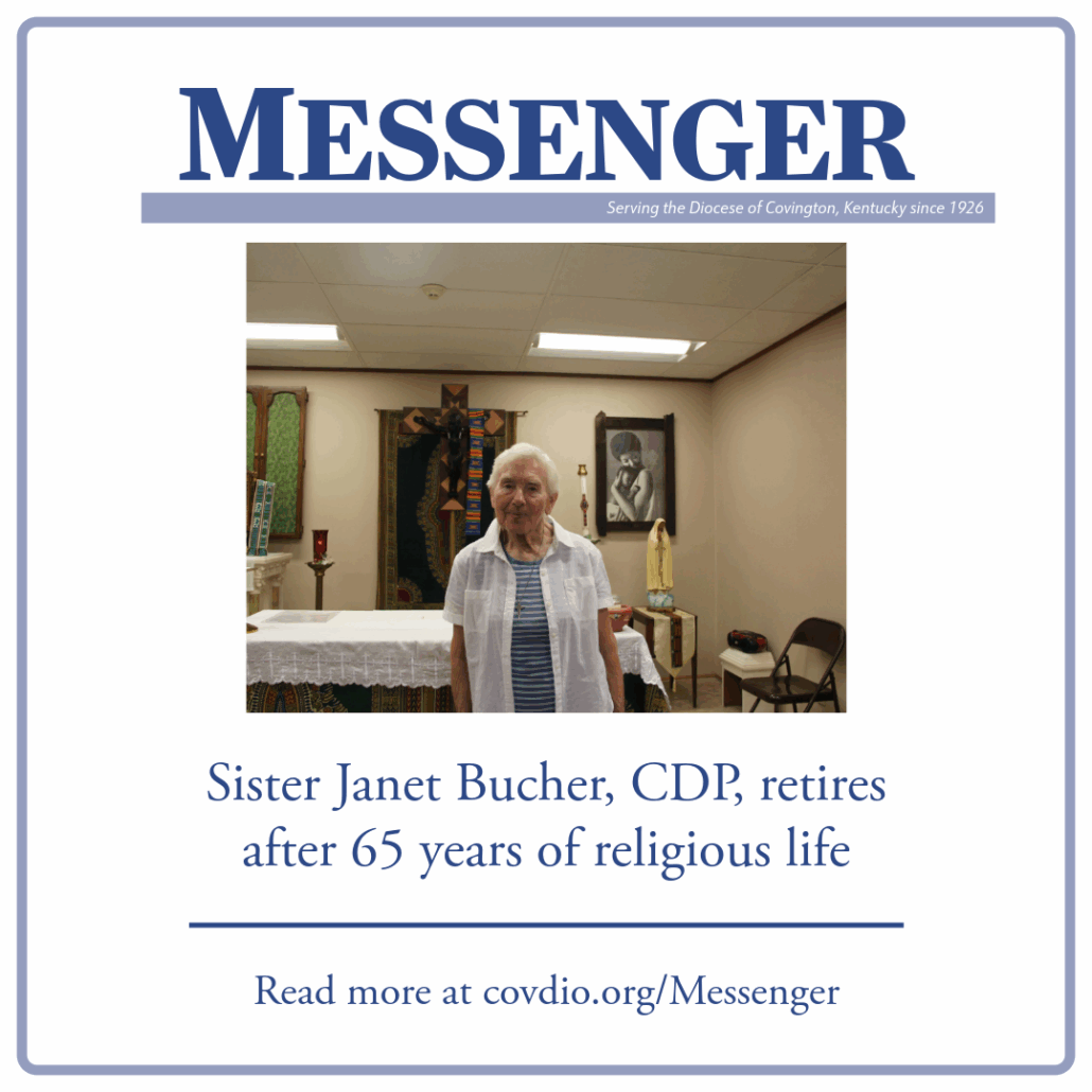 Congregation of Divine Providence Sister Janet Bucher, who has been serving the Diocese of Covington and beyond for 65 years, has retired Monday, July 14. Sister Janet discerned religious life as a young adult, having “just felt a call,” she said. She often helped the sisters at her grade school, St. Aloysisus. She always appreciated the sisters who had taught her, and said she felt an “inner sense” toward religious life. Sister Janet attended Our Lady of Providence Academy in Newport until she entered the convent at St. Anne, Melbourne, where she finished high school. In 1958, Sister Janet made her profession religious vows.