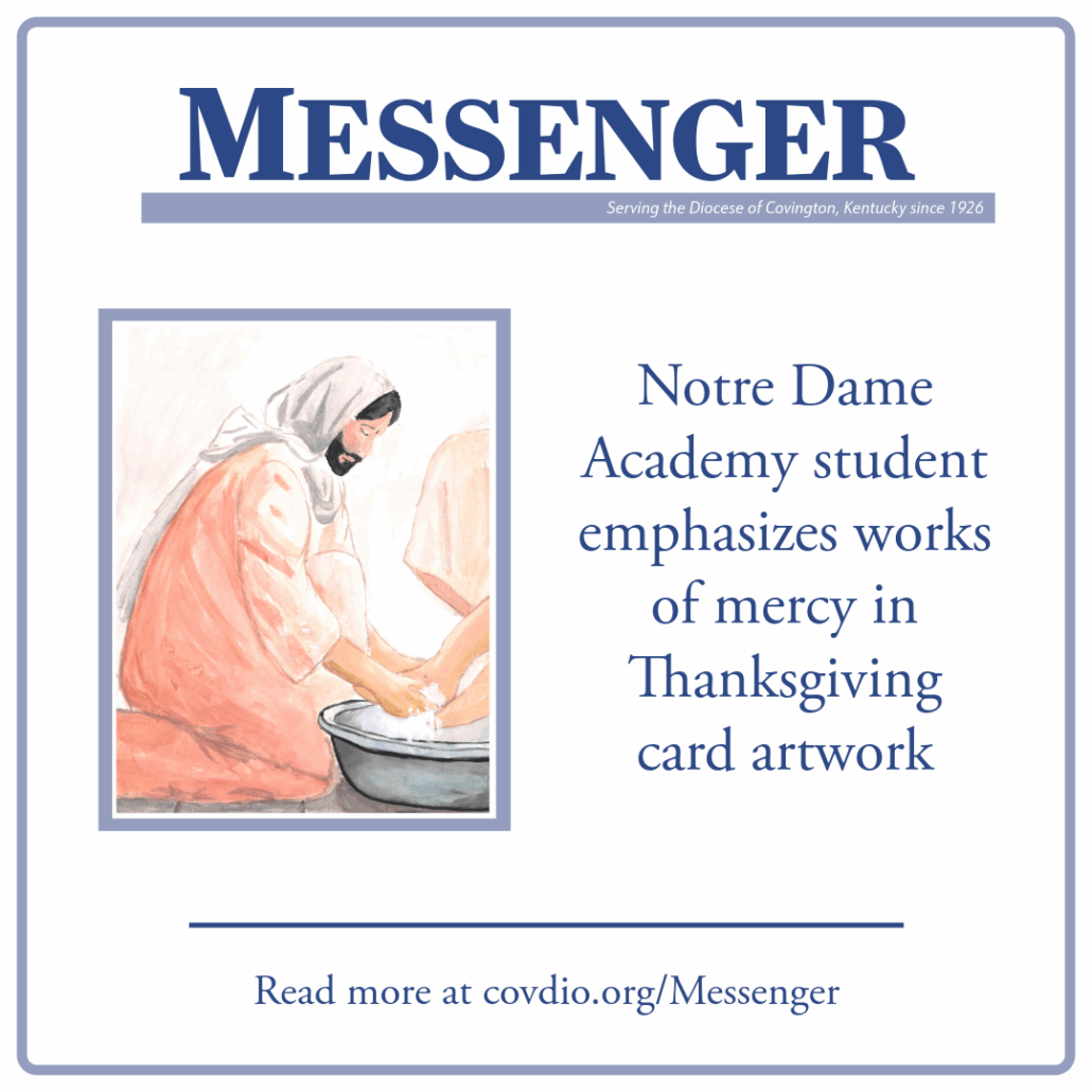Greidy Deleon’s watercolor depiction of Jesus washing the feet of the apostles has been selected as the artwork for Bishop John Iffert’s annual Thanksgiving card, sent to over 7,000 people throughout the Diocese of Covington. Ms. Deleon is a student of Notre Dame Academy, Park Hills, her artwork was selected from that of her peers to represent Bishop Iffert’s message of thanksgiving.