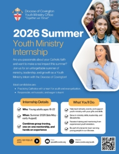 College students – are you looking for a meaningful way to grow in your faith while serving others this summer? The Diocese of Covington is inviting motivated students to apply for its Summer Youth Ministry Internship — a transformational experience rooted in prayer, leadership, and real ministry impact. Application deadline: February 27. Program description & Applicant InformationApplication Form